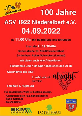 Mit einer großen Feier mit reichlich Essen, Trinken, Unterhaltung und Live Musik will der ASV 1922 Niederelbert am 04.09.2022 sein 100 jähriges Bestehen feiern!