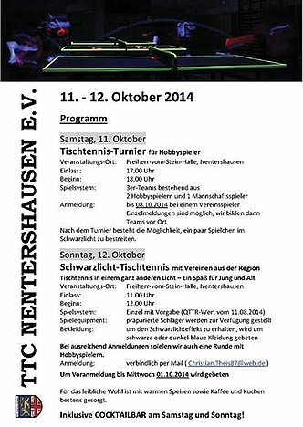 Der TTC Nentershausen veranstaltet am Sonntag, 12. Oktober 2014, ein Schwarzlicht-Turnier für TT-Spieler und Hobbyspieler.